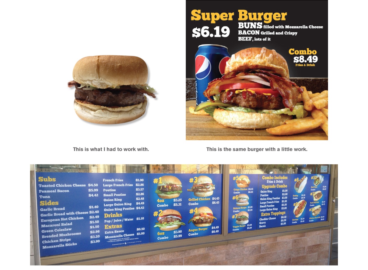 Food stylist and signage design for Super Burger on Lakeshore. Just look at how mouth watering those burgers are.